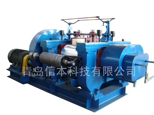 精炼机用以清除再生橡胶中所含杂质,表面光滑,略呈腰鼓形的前后辊筒在相对面转的过程中,将胶料中的硬杂物从辊筒中间部分逐渐向两端挤压,聚集在胶片的边缘上,用割胶刀即可将边缘杂质去除。
